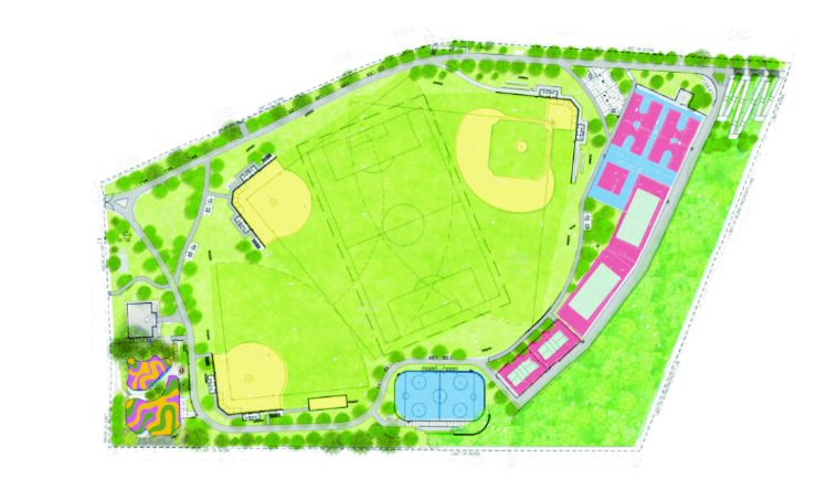 With no snow on the ground, one can view the construction vehicles hard at work in the park and catch glimpses of the splash pad, in-line hockey rink, accessibility ramp, entry plazas, and new scoreboards.