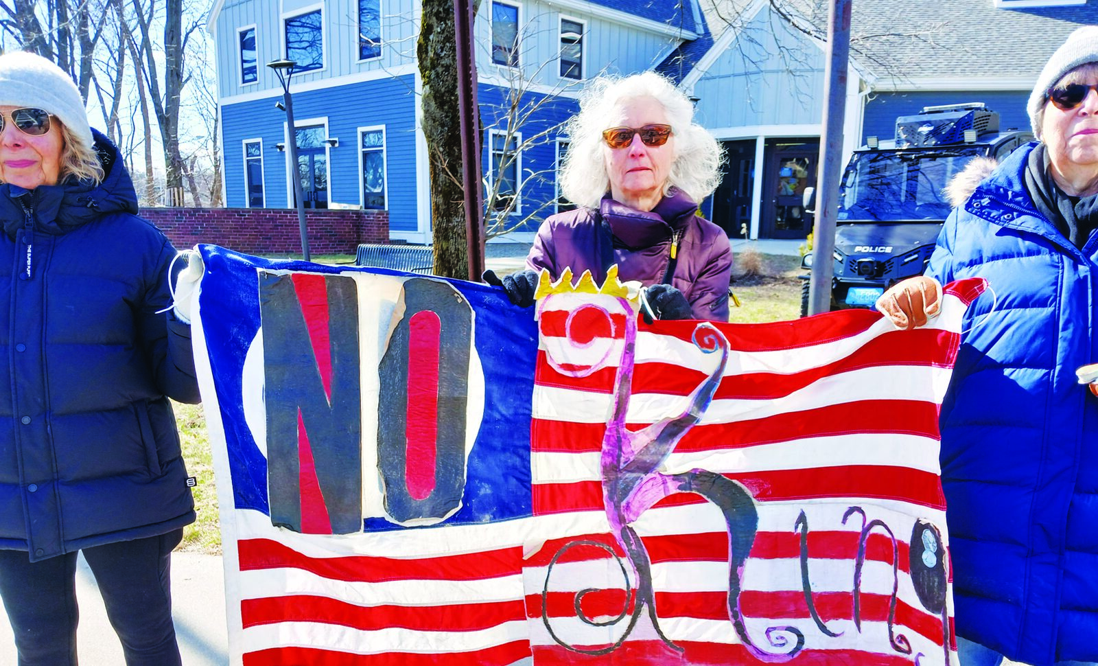 About 550 residents gathered at the West Roxbury rotary as part of the March 28 No Kings rally, joining an estimated 3,200 similar worldwide events to protest the Trump administration’s policies. Organized by Progressive West Roxbury / Roslindale (PWRR), the rally featured a welcoming atmosphere and a variety of signs, from simple handwritten messages on a paper bag to professionally designed posters with art deco graphics. Both the inner and outer areas of the rotary were filled with sign holders, some dressed in costumes.